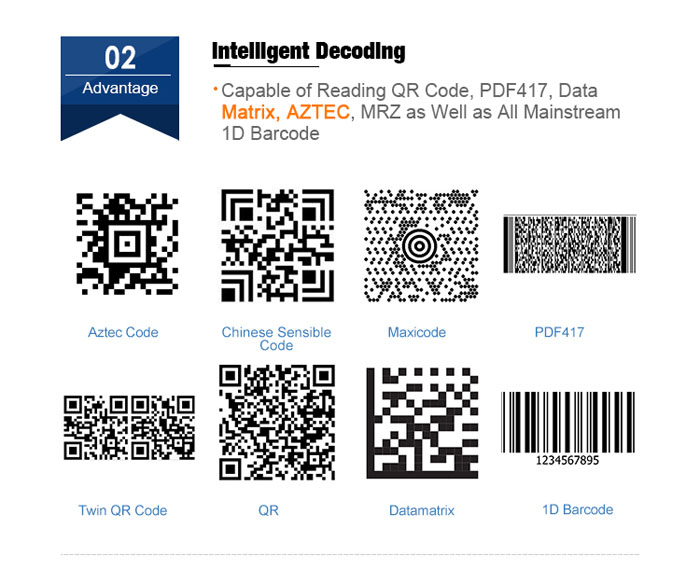 Symbologies | 2D | PDF417, QR Code, Data Matrix, AZTEC, CSC, Maxicode, Micro QR, Micro PDF417, GM, Code One, ect. | |